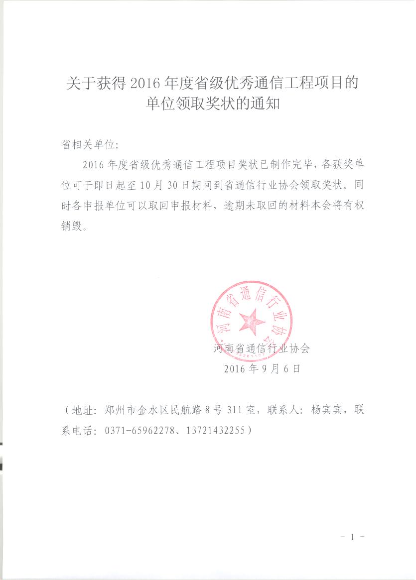 關(guān)于獲得2016年度省級優(yōu)秀通信工程項目的單位領(lǐng)取獎狀的通知