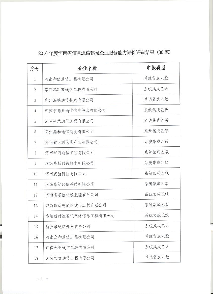 關(guān)于2016年度河南省信息通信建設(shè)企業(yè)服務(wù)能力評價(jià)評審結(jié)果公示的通知