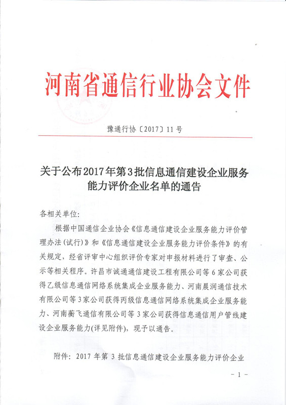 關(guān)于公布2017年第3批信息通信建設(shè)企業(yè)服務(wù)能力評價企業(yè)名單的通告