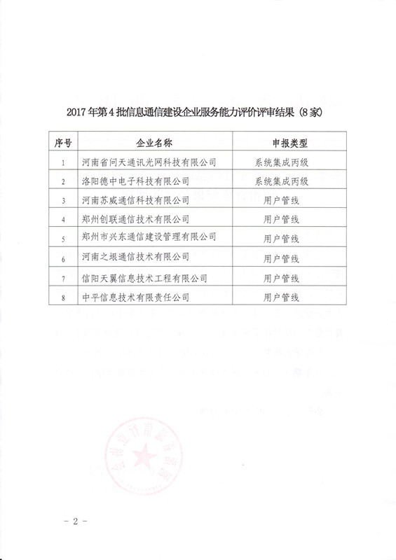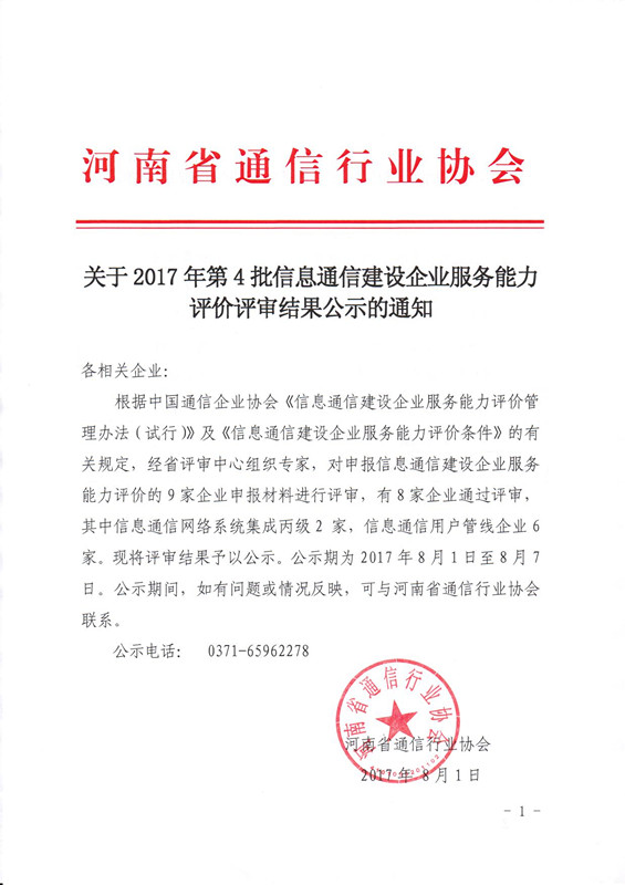 關(guān)于2017年第4批信息通信建設(shè)企業(yè)服務(wù)能力評(píng)價(jià)評(píng)審結(jié)果公示的通知