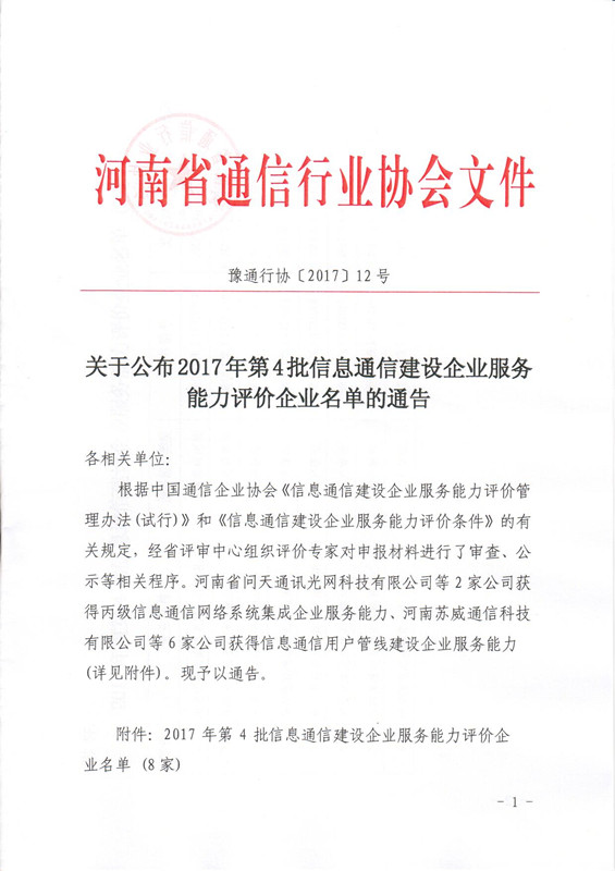 關(guān)于公布2017年第4批信息通信建設(shè)企業(yè)服務(wù)能力評價企業(yè)名單的通告