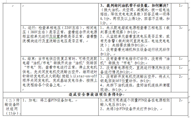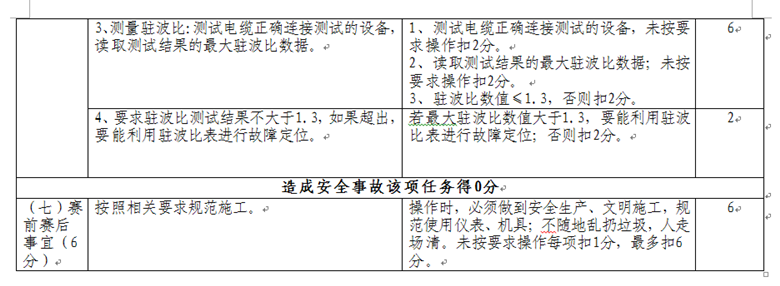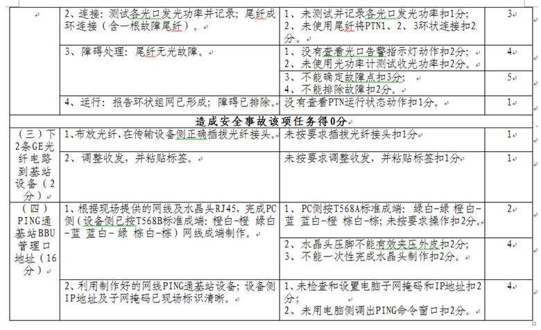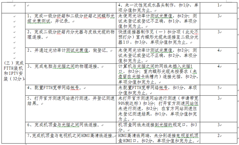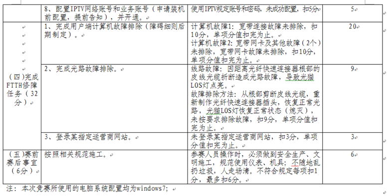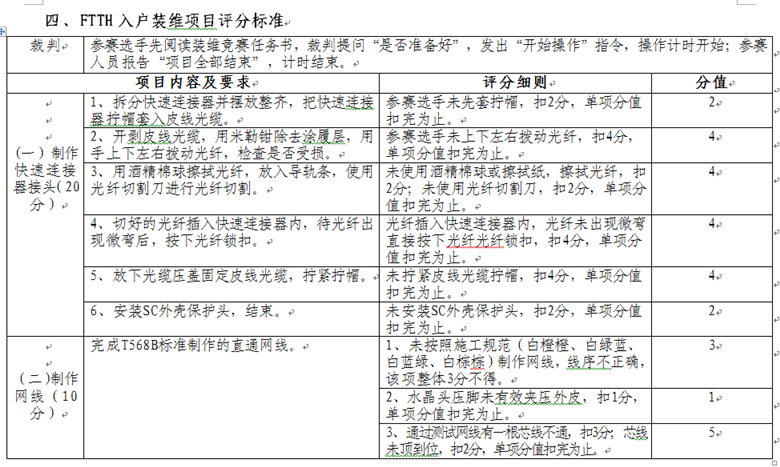 依據(jù)工業(yè)和信息化部頒布的通信設備、通信線路、光纜傳輸、通信電源等一系列國家標準、行業(yè)標準和工程技術(shù)規(guī)范,按照通信行業(yè)職業(yè)技能鑒定相關規(guī)范要求,制定了通信設備傳輸及無線、基站動力配套、通信光纜線路、FTTH入戶裝維四個競賽項目內(nèi)容、操作要求及評分標準。具體內(nèi)容如下: