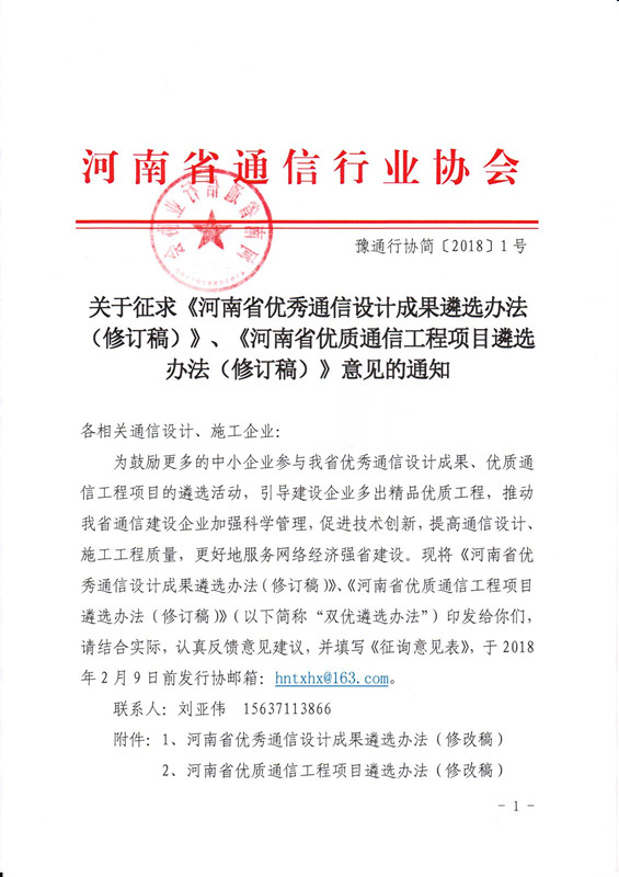 關(guān)于征求《河南省優(yōu)秀通信設(shè)計成果遴選辦法(修訂稿)》、《河南省優(yōu)質(zhì)通信工程項目遴選辦法(修訂稿)》意見 的通知