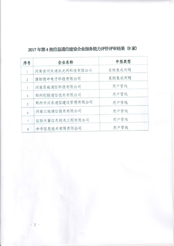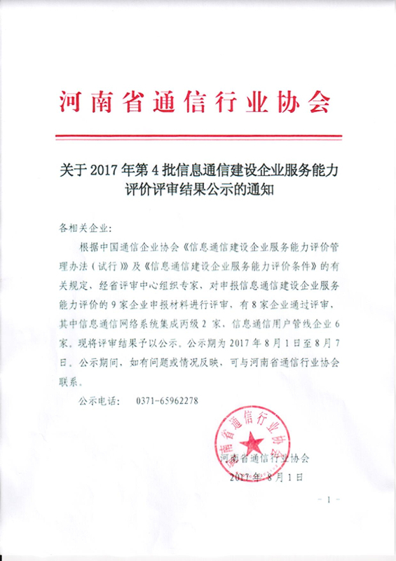 關(guān)于2017年第4批信息通信建設(shè)企業(yè)服務(wù)能力評(píng)價(jià)評(píng)審結(jié)果公示的通知