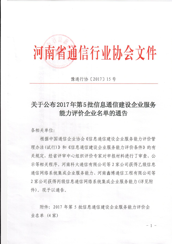 關(guān)于公布2017年第5批信息通信建設(shè)企業(yè)服務(wù)能力評(píng)價(jià)企業(yè)名單的通告