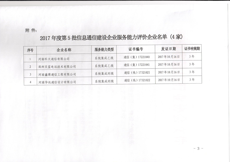 關(guān)于2017年第5批信息通信建設(shè)企業(yè)服務(wù)能力評(píng)價(jià)評(píng)審結(jié)果
