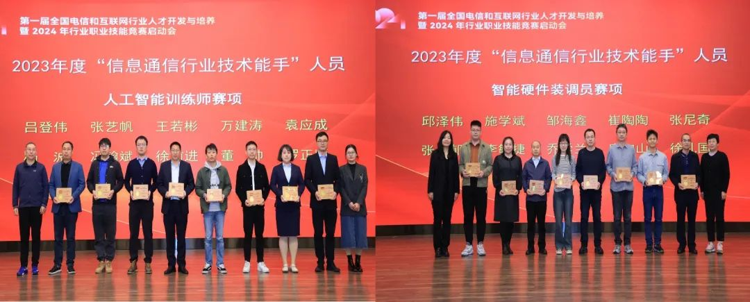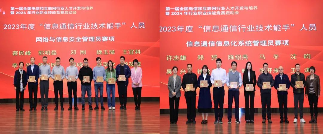 會(huì)上宣讀并表彰了2023年度第四屆全國(guó)電信和互聯(lián)網(wǎng)行業(yè)職業(yè)技能競(jìng)賽獲“信息通信行業(yè)技術(shù)能手”稱號(hào)人員和2021-2022年度全國(guó)行業(yè)職業(yè)技能競(jìng)賽獲“全國(guó)技術(shù)能手”稱號(hào)人員,來(lái)自中國(guó)電信股份有限公司安徽分公司陳燦、中國(guó)聯(lián)合網(wǎng)絡(luò)通信有限公司山東省分公司祁冬分別代表“行業(yè)技術(shù)能手”和“全國(guó)技術(shù)能手”發(fā)言。同期,會(huì)上舉辦了“第五屆全國(guó)電信和互聯(lián)網(wǎng)行業(yè)職業(yè)技能競(jìng)賽”啟動(dòng)儀式。
