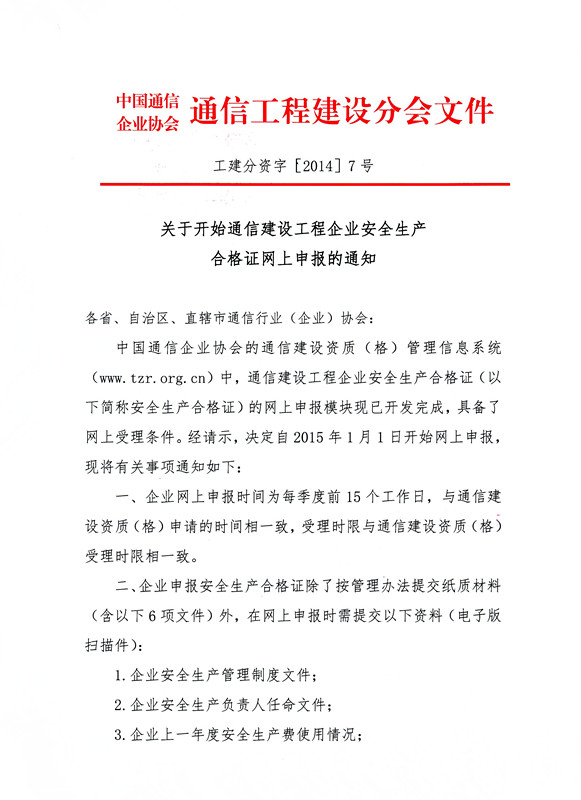 關于開始2015年通信建設工程企業(yè)安全生產合格證網上申報的通知