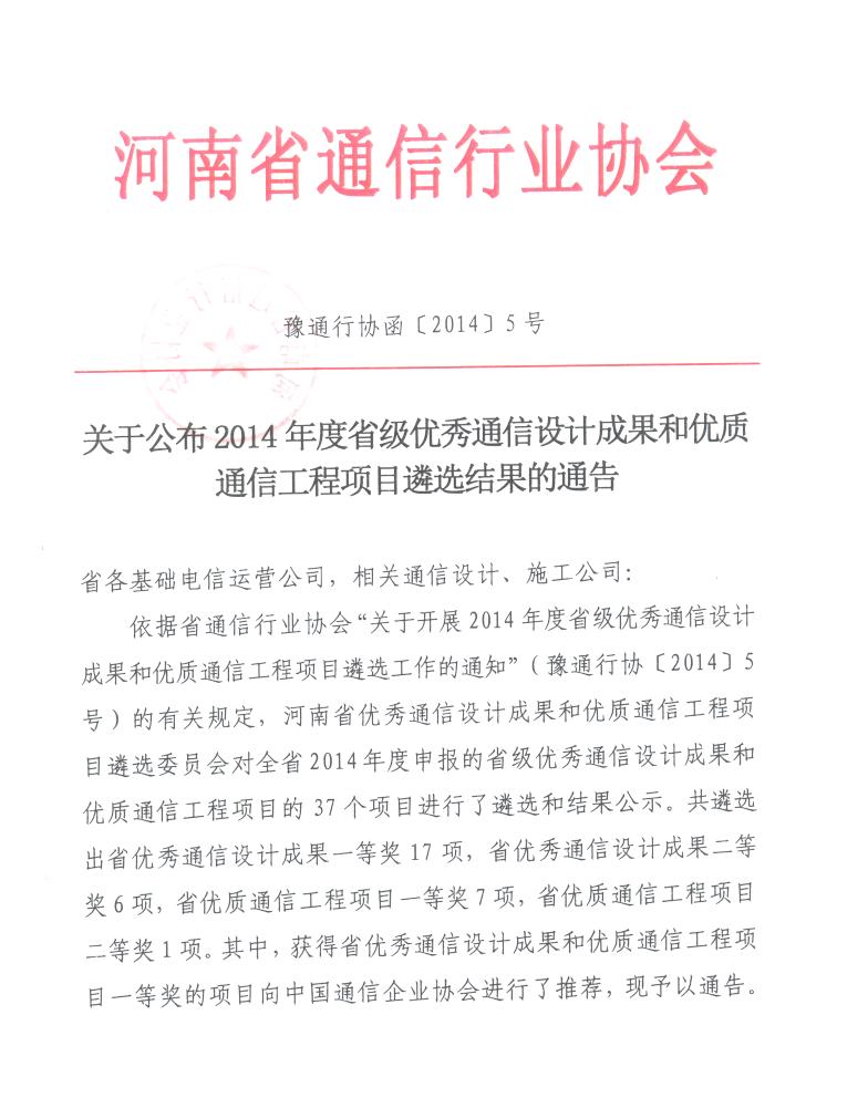 關(guān)于公布2014年度省級優(yōu)秀通信建設(shè)項(xiàng)目設(shè)計成果和優(yōu)質(zhì)通信工程項(xiàng)目遴選結(jié)果的通告